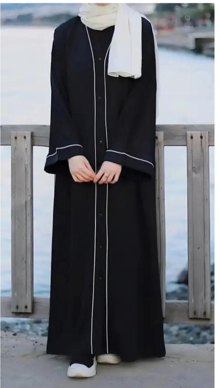 Refined, minimal, and timeless — this black Nida abaya features elegant white contrast piping and a button-down front for a modern touch. Crafted from premium Nida fabric, it offers a soft, flowy drape and all-day comfort. Perfect for casual outings, formal events, or daily wear, it comes with a matching hijab to complete the look.