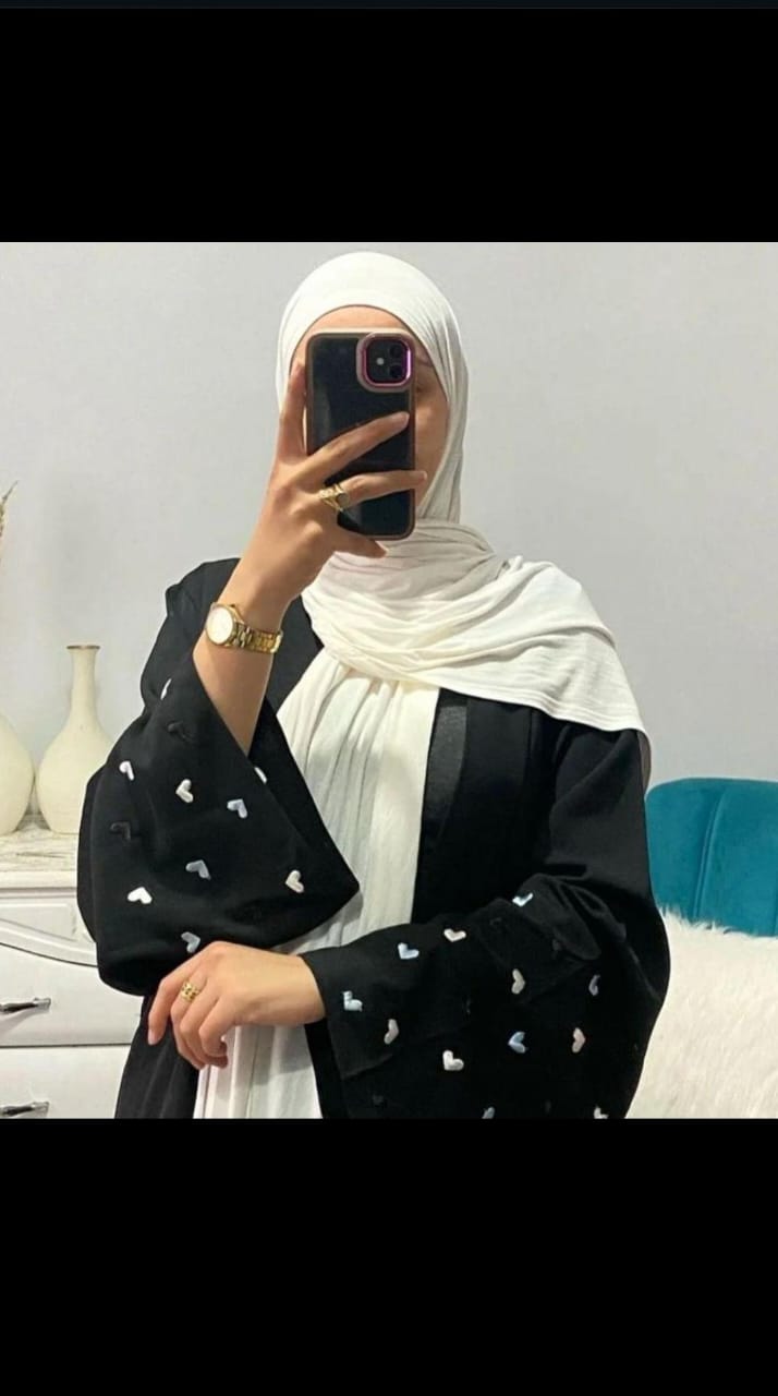 Elevate your modest style with this elegant black Nida abaya, beautifully detailed with white and blue heart embroidery on the sleeves. Made from premium quality Nida fabric, it’s soft, breathable, and perfect for all-day wear.